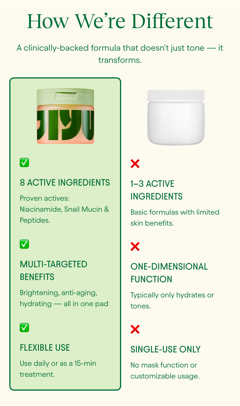 Packed with 8 Korean actives like Niacinamide, Snail Mucin & Peptides, JiYu's toner pads visibly fade spots, refine texture, and boost elasticity — swipe daily or leave on for targeted treatment.